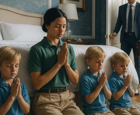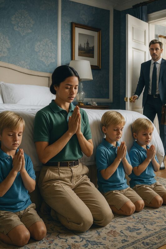 His three boys — Leo, Max, and Jules — on their knees beside her, tiny hands clasped together, eyes shut tight in a moment so intimate, so unexpected, it jolted him like an electric shock.