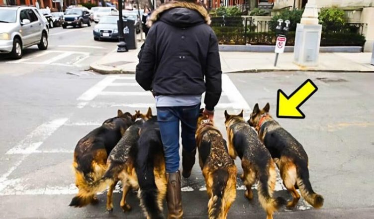 People in the neighborhood barely noticed him anymore. Five German Shepherds, walking in a perfect line beside him, paws moving in the same rhythm, heads slightly lowered, eyes focused straight ahead.