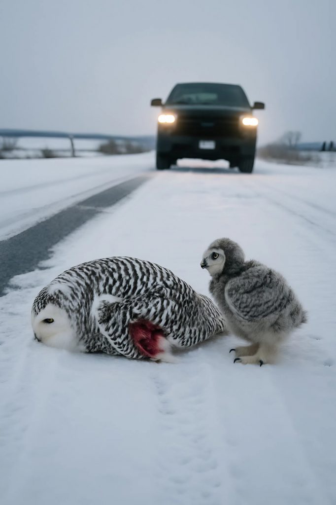 At first, he thought it was just another snowdrift. But then he noticed a shape — white, still, and oddly out of place. His heart gave a jolt. He stepped closer and froze: lying at the edge of the road was a polar owl, motionless, covered in frost. Its wing was twisted at an unnatural angle.