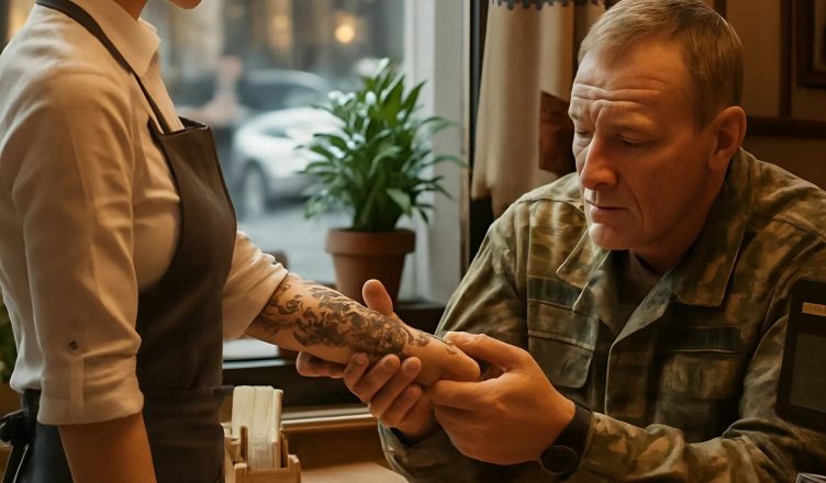 The air in the café grew heavy, like before a storm. The veteran slowly lowered his gaze to her tattoo, then met her eyes again.