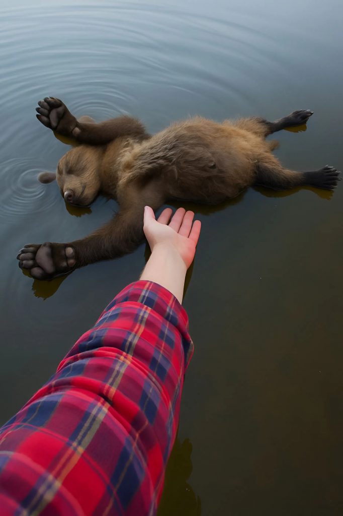 I walked along a turbulent river when my eyes caught something strange — a tiny bear cub’s body was floating on the surface of the water.