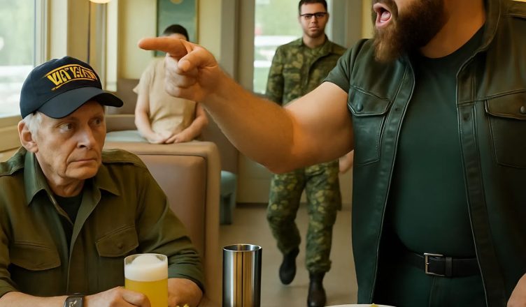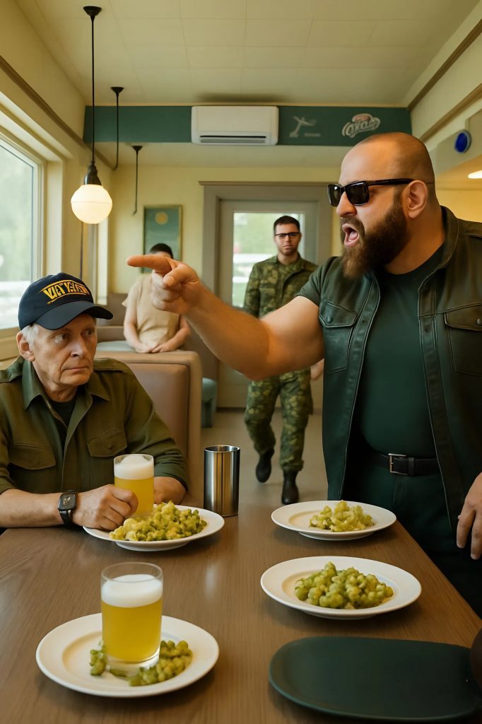 The next sound was a sharp slap. The veteran’s cap fell to the floor, coffee spilled across the table. A young waitress pressed her hand to her mouth, a mother covered her child’s eyes. The motorcyclist let out a raspy laugh: