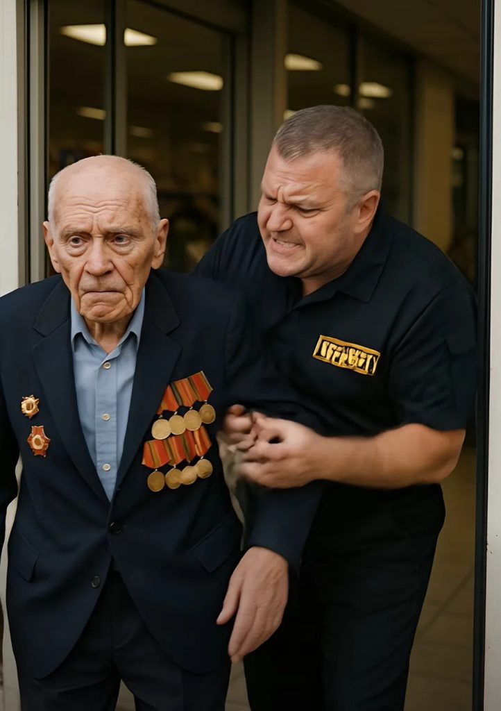 A large, heavyset guard in his fifties walked up, grabbed the old man by the shoulder, and began to push him toward the door.