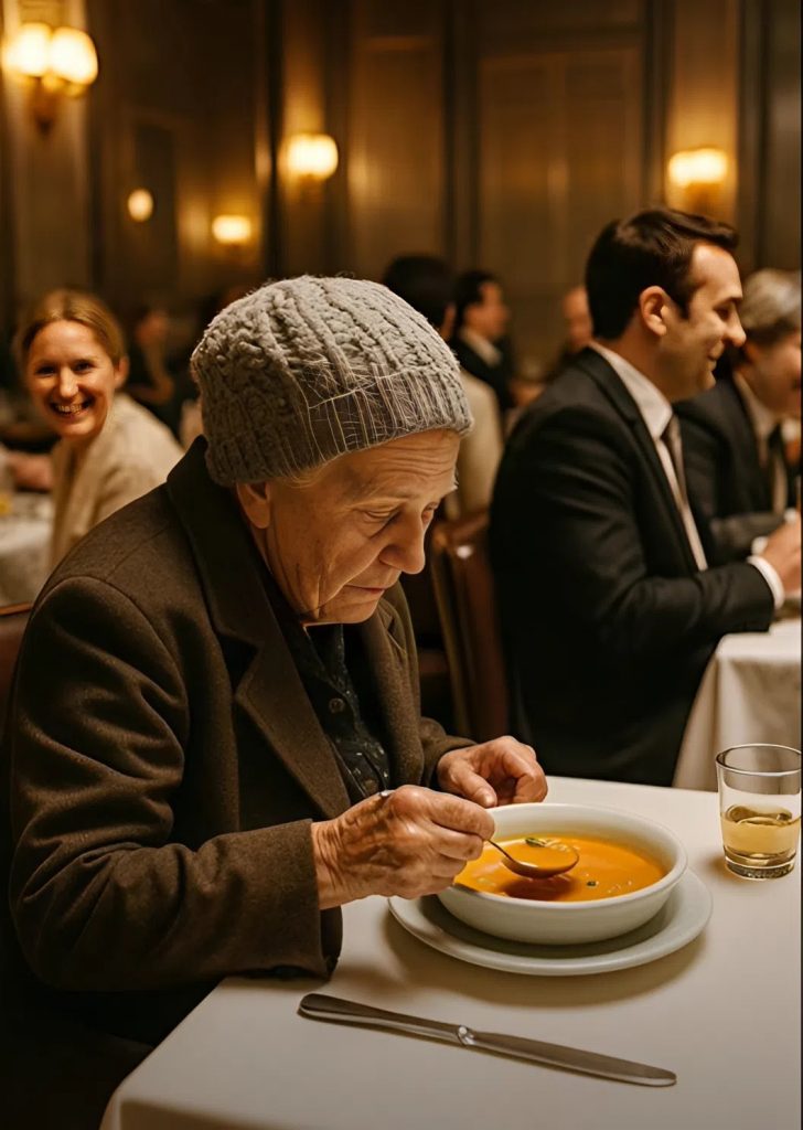 A few moments later, her table was filled with the restaurant’s finest dishes. The guests watched silently as the old woman, humbled and moved, folded her hands once more in gratitude.