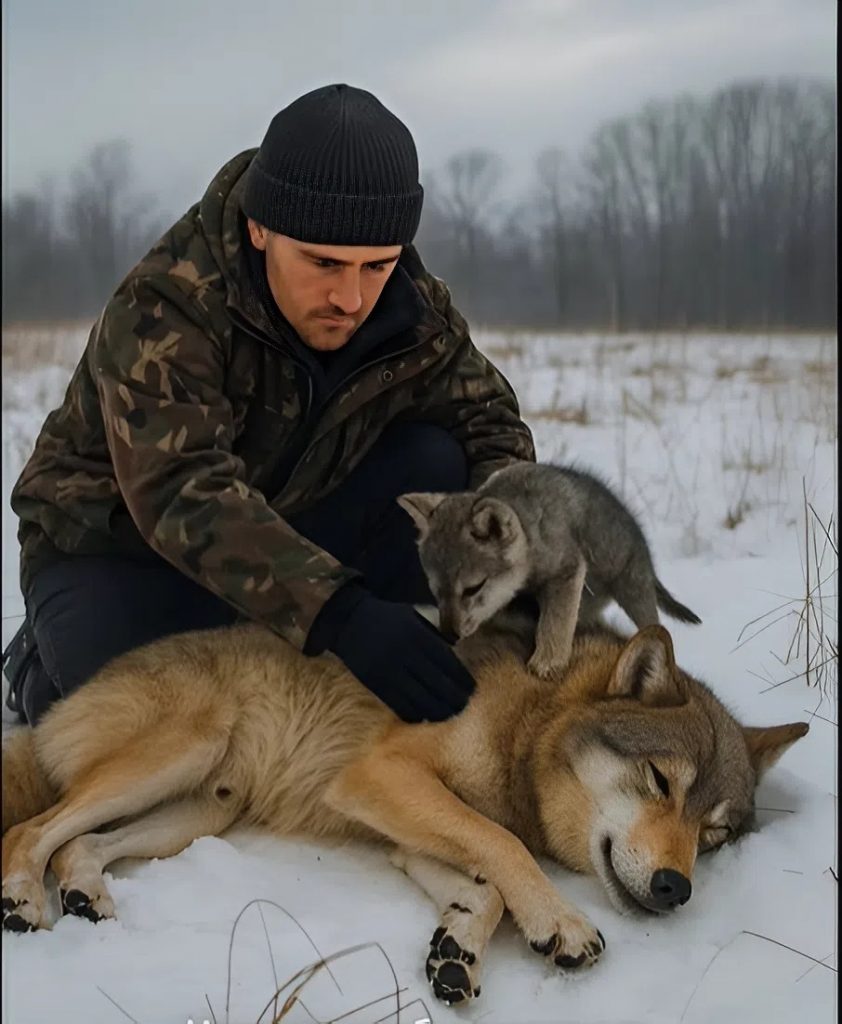 Finally, the she-wolf slowly approached him, lowered her head to the ground, and let out a quiet breath. The pup pressed against his legs, then took a step forward, as if inviting him to follow. The villagers watched as the man and the wild animals disappeared into the forest, feeling both awe and fear at the same time.
