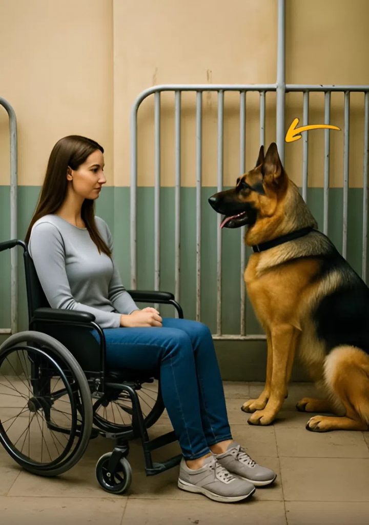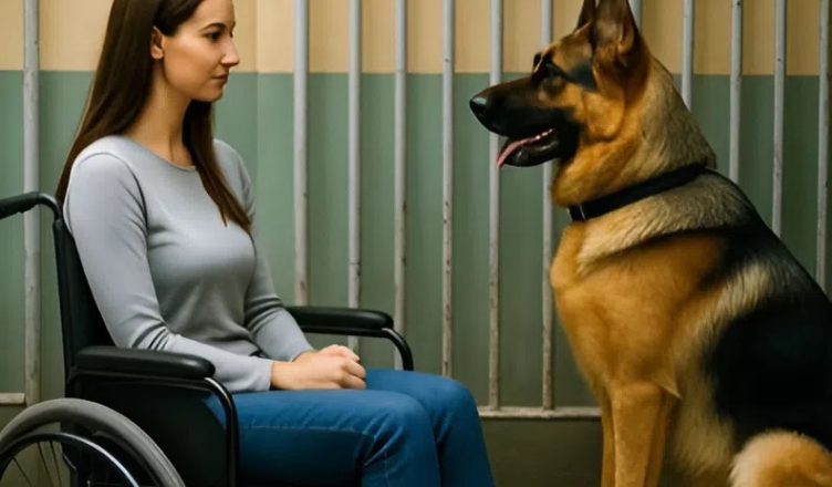 The German Shepherd, who just a second ago looked tense and ready to pounce, suddenly lowered herself onto her front legs—not in an attack, but in a strange, almost remorseful gesture. She slowly moved closer to the wheelchair, as if checking whether she was even allowed to approach. Her huge muzzle trembled, her breathing quickened, but in her eyes appeared something that made the shelter worker’s skin crawl.
