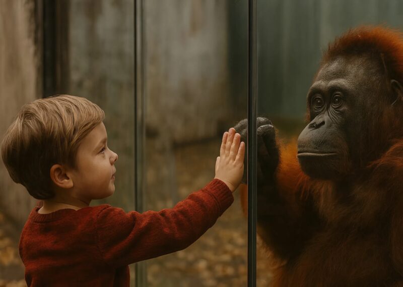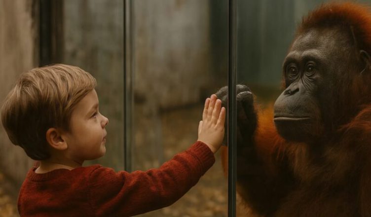 “Because he used to do the same thing… with another little boy who tried to comfort him back then. That child would cry and press his palm to the glass of his cell. The orangutan never forgot. That was the only gentle contact he had with a human for years.”