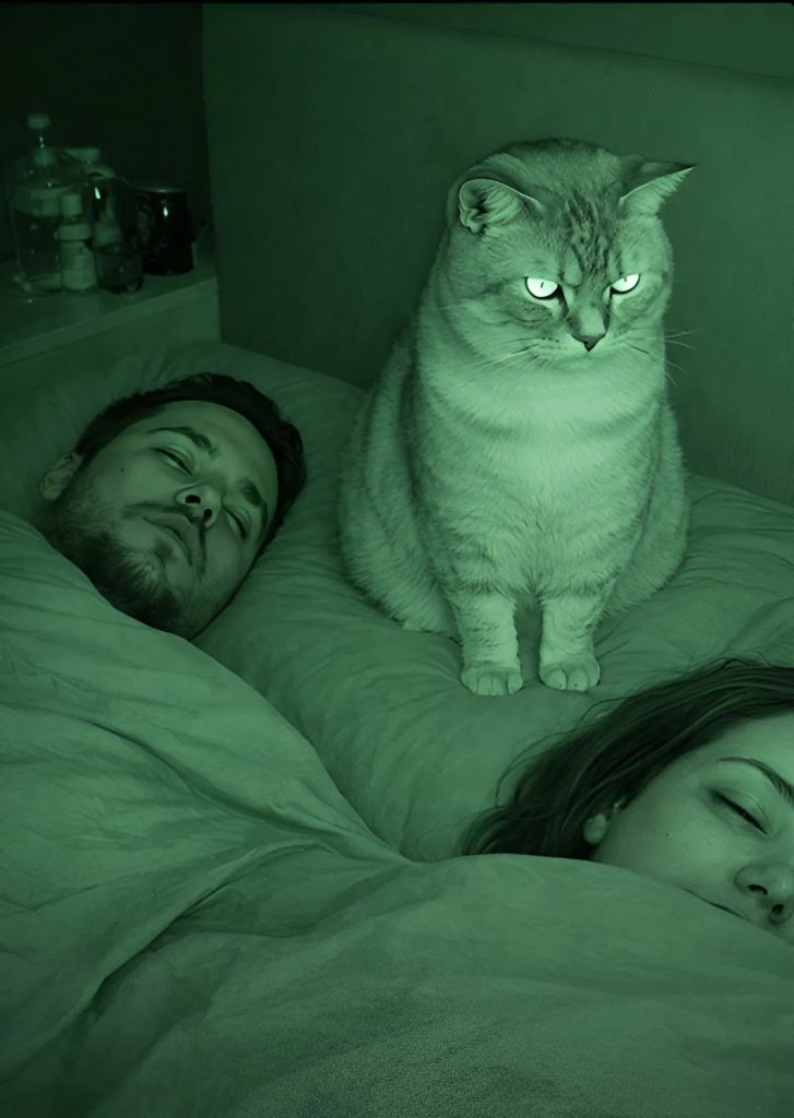 When I replayed the night recording and began watching it minute by minute, I immediately sensed that something was wrong. The camera had captured the entire night—from the moment we turned off the lights until morning. At first, everything looked ordinary. We slept peacefully, occasionally shifting in our sleep. The room was dark and quiet. Our cat lay calmly on her bed near the wall, just as she always had.