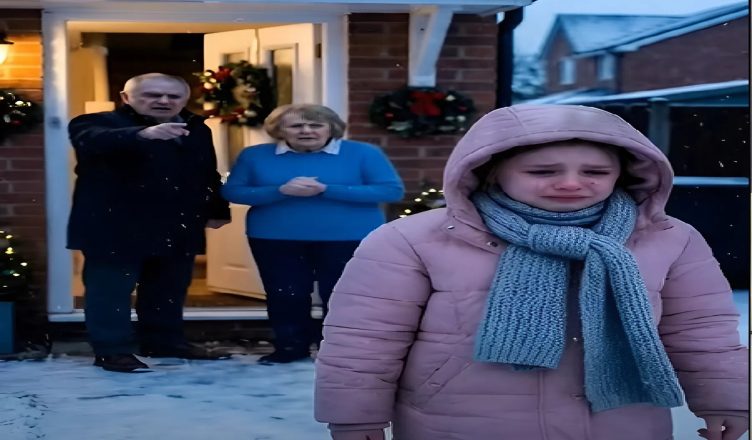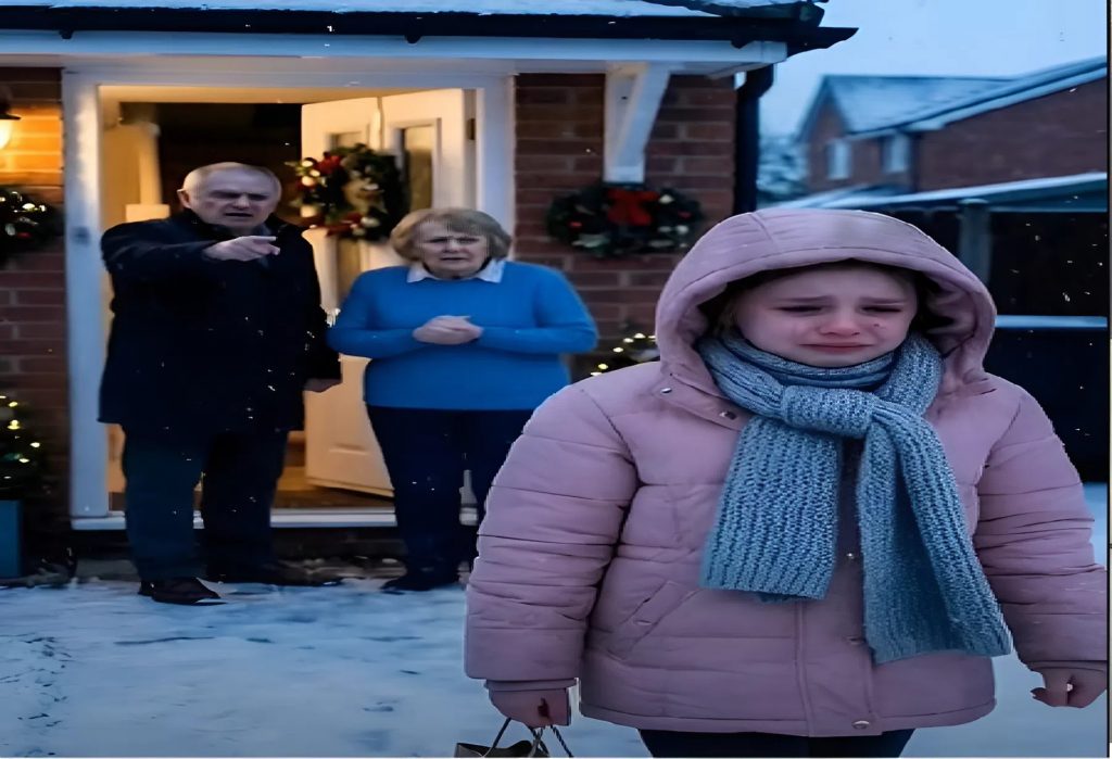 The icy wind howled between the houses, turning falling snow into sharp needles that cut against her skin. She sat on the front steps in her thin pajamas, trembling, clutching a small, soaked gift package to her chest.