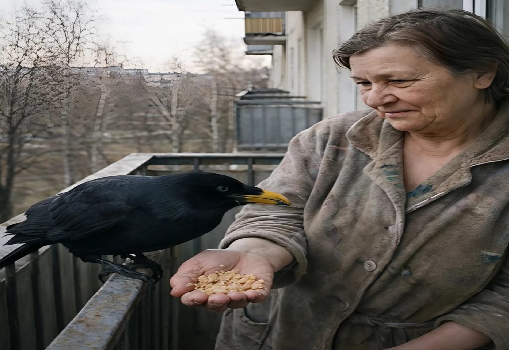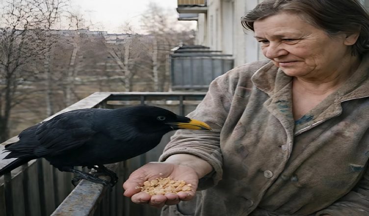 At first, it happened almost by accident. One cold winter day, she scattered a handful of bread crumbs along the railing of her balcony—simply to break the silence. The bird did not approach immediately. It watched her from the branch of an old birch tree in the courtyard below. Black, sleek, sharp-eyed. Only after several long minutes did it dare to fly closer.