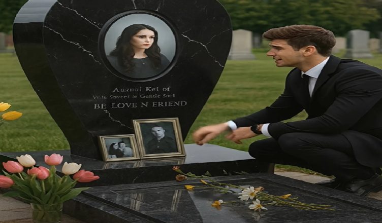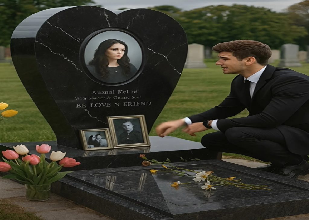 In front of him stood a large black headstone shaped like a heart. Her photograph was engraved in the center—her gentle smile unchanged. Fresh flowers surrounded the grave. Someone had clearly been visiting often.